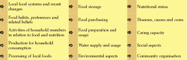 Step 1: Data collection at the capital, provincial and district level (government institutions, NGOs etc.) Methodology: a) Review of scientific literature, which can provide some poverty oriented cause-effect-relationships for the population in a specific country. b) Review of information gained in governmental offices (Health department, agricultural sector, statistical offices etc.), which provide useful general data on the demographic, health and socio-economic situation at a regional level. c) Review of studies conducted by international organisations (World Bank, World Food Program, International Red Cross, Medecins sans Frontière) and national NGOs (Associations working in the area of public health, nutrition, women’s affairs, watershed management or rural development). The outcomes: a) First Interim Report. b) Suggestions and assumptions, based on the review of the literature and secondary data records, for reflection and study in the rural/ urban areas and communities. Step 2: Collection of information in a predefined urban or rural community, targeting local governments, NGO representatives and the people Methodology: a) Several trips to selected communities should be undertaken to talk with the people in the surveyed area. b) Transects should be made with local government officers and community leaders, through the district or community, in order to observe and compare the secondary data and the verbally commu nicated information with the reality. c) Group discussion should be carried out with local people, to obtain an idea about food habits, beliefs, customs and perceived needs in the sector of food security. d) Measuring the body stature of school children could be a tool if no anthropometric data is available in the region. Measuring the height of children with a simple anthropometric tape can provide important information on chronic malnutrition i. e. if children are too small for their age. This reflects the poor conditions or poverty situation in the communities. The outcomes: a) Second Interim Report, based on the outcome of the talks with local key persons, semi-structured interviews, and question guidelines applied during group discussions in the field. Step 3: Data analysis and report for discussions with representatives of relevant national institutions and interested NGOs Methodology: a) The analysis of the survey forms provides comparable information between communities or geographical areas. b) The analysis of the semi-structured interviews provides complementary information about the perception of the people concerning nutrition and poverty. c) The analysis of the group discussion provides specific topics (problems, ideas, doubts, perceptions, self-assessment of poverty etc.), which could have emerged during the discussion process at community level. d) Cross checking the different sources of information and persons to be involved during project identification helps clarify the understanding of the nutritional and/or poverty situation of the population. Outcomes: a) The final report, including the main findings, hypothesis for the project planning and conceptualisation of areas to be studied in detail, and the general conclusion on the nature of the project (e.g. Integrated Food Security Project, agricultural extension project, community development project, specific nutrition project etc.) Summary The following table presents the elements that need to be scheduled while undertaking a RAN during the project identification stage. The table summarises the previous steps 1-3 into 16 smaller steps. Useful forms for field work Two types of practical forms have been developed to facilitate the application of RAN during project identification: