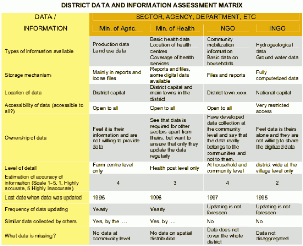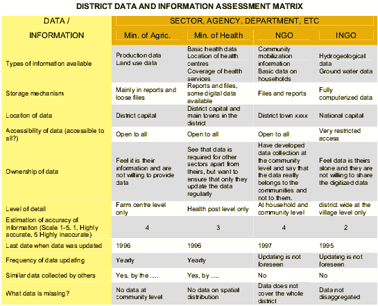 Using a similar matrix as provided in the example below, the planner should undertake a systematic assessment of the data and information available for planning.Step 1:Develop a similar matrix as provided in the example below, however, please adapt the example to suit the purposes and requirements. Step 2:Assess all the data and information which is available in your office. Step 3:During discussions and interviews with all sectoral line agencies and all other developmental agencies working in the district, assess their own data availability. Step 4:Agencies or departments who can not be readily interviewed could be asked to complete the matrix and submit this to your office. |