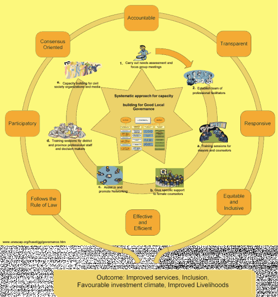 Step 1: Contextual needs assessment:Without knowing exactly what is needed as far as capacity building is concerned, a programme to improve the capacity is unlikely to be properly targeted and focused. This method refers to capacity building for good local governance. The elements that make up good local governance are illustrated in figure 2.