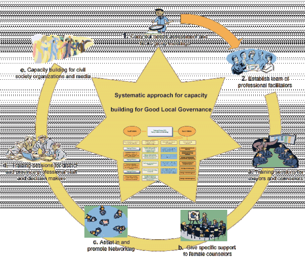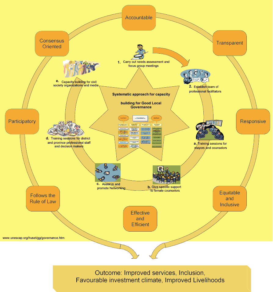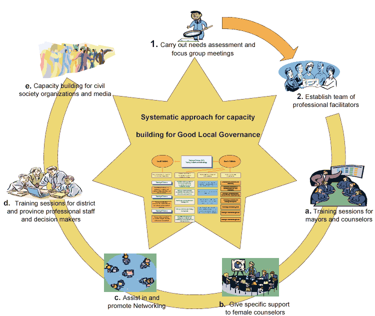 Figure 2: How capacity building is expected to contribute to good local governance Step 2: Establishing team of professional facilitators:Establishing a team of professional facilitators possessing sufficient knowledge, skills and confidence to handle the challenges in promoting democratic and good local governance based on participatory and adult learning approaches forms the second step in the process. The formation of groups of professional facilitators at the local level is one way of ensuring that professional training and advisory services can continue to be offered once the development programme has ended. Such a corps of local trainers is all the more important in rural areas where professional expertise is rare. While training either professionals or trainers (through training of trainer courses), emphasis needs to be placed on building their capacities for process moderation within the context of the political reform processes. Reflection teams or small work-groups are established to exchange experience, discuss issues and monitor the progress made on assignments given by the trainers.