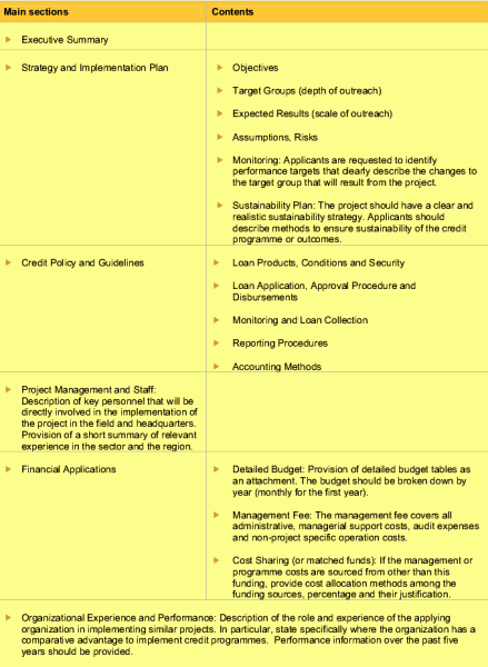 Prepare a Request for Proposal (RFP) and invite pre-selected intermediaries to participate in the tender. The RFP includes background information, statement of purpose, objectives, request for proposal with contact data and the applications guidelines. An application guideline which includes the elements to be covered in the proposal, is depicted in table 1.