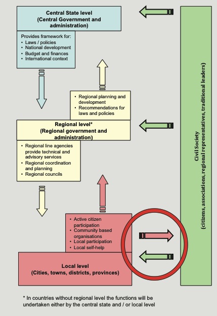 The local state administration system is embedded into a whole hierarchy of administrative, legislative and executive correlations at the local, the sub-national and the national level. Understanding how the relationships are functioning is the key to being able to effectively focus capacity development assistance. Therefore a detailed analysis of power structures and roles, functions and inter-connections between the different organisations making up the local state administration is needed. At the same time this should result in an essential overview of how the linkages are to the next higher administrative level. Furthermore the analysis should look into the financial flows and command lines. In countries where some degree of decentralisation is planned or is in place it is very important to understand the whole decentralisation process in which roles and functions are often well spelled out.