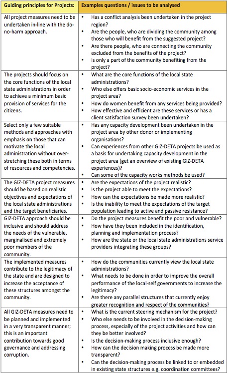 The implementation of the measures to strengthen local state administrations structures and organisations require that post conflict/ post disaster projects follow some basic principles. The following table 2 provides an overview of these basic principles as well as support questions: