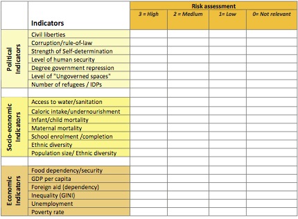 This can be observed or further assessed through a systematic set of indicators that can be correlated to the four main causes of fragility that have been elaborated above. Table 3 provides an example of how the external risk can be both assessed and monitored. In addition to these risks, post conflict/ post disaster projects also faces additional risks that are directly related to the way in which the programmes are designed. The main ones include: